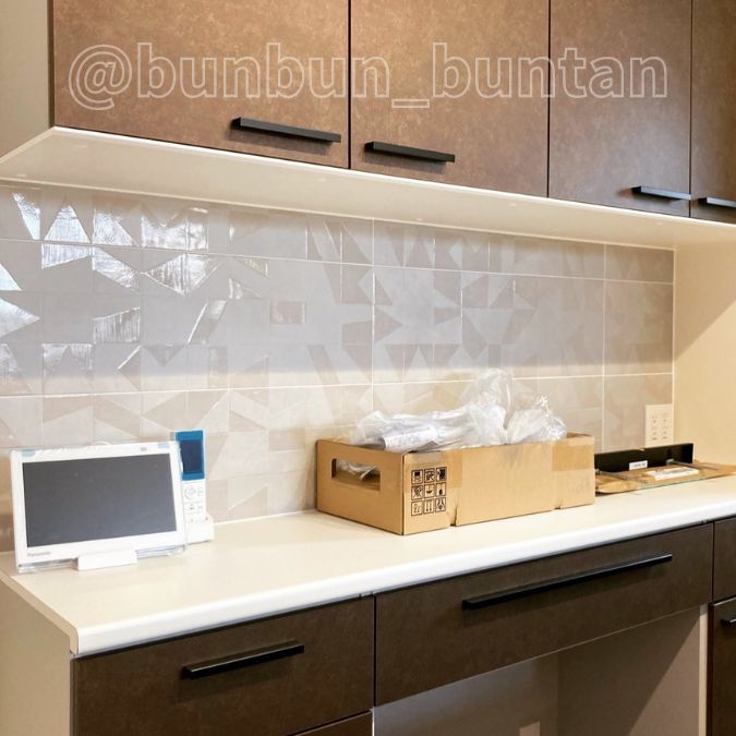 一般的なキッチンタイルサイズの1:2ではなく、縦横比が大きい1:4の物を採用。これによって横に広い高級感を少しでも出せたら、と思いました